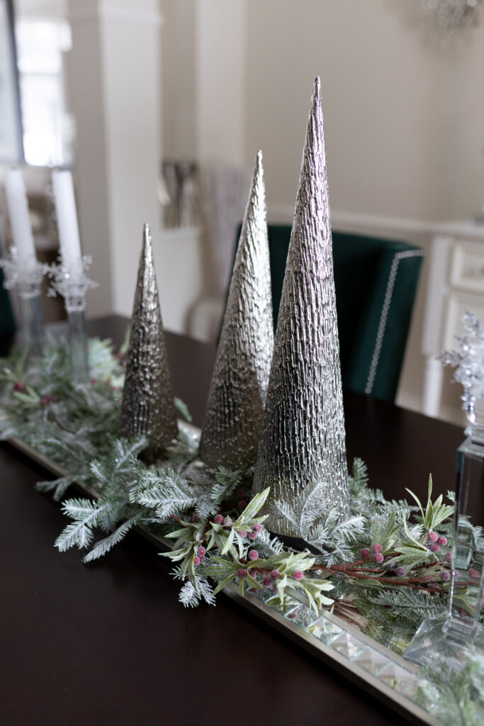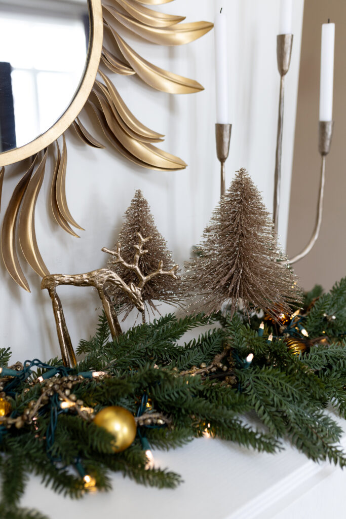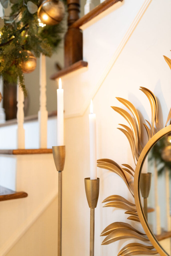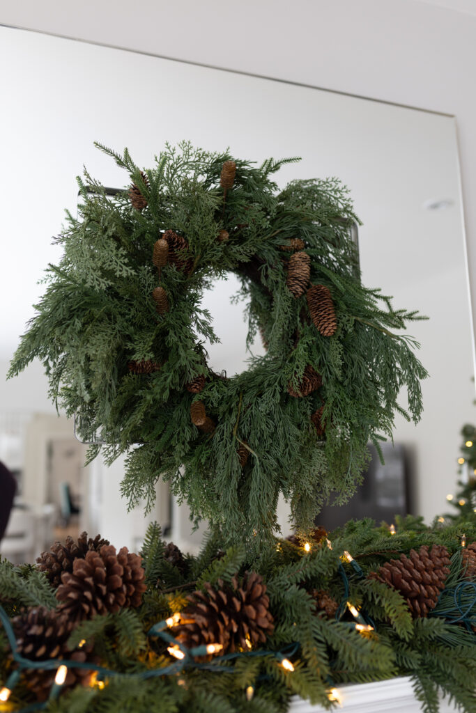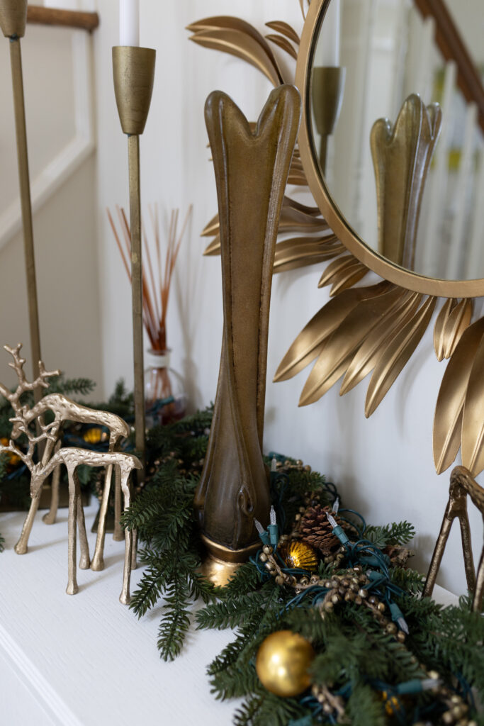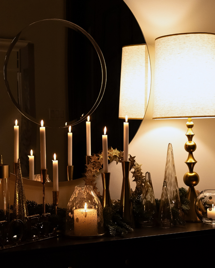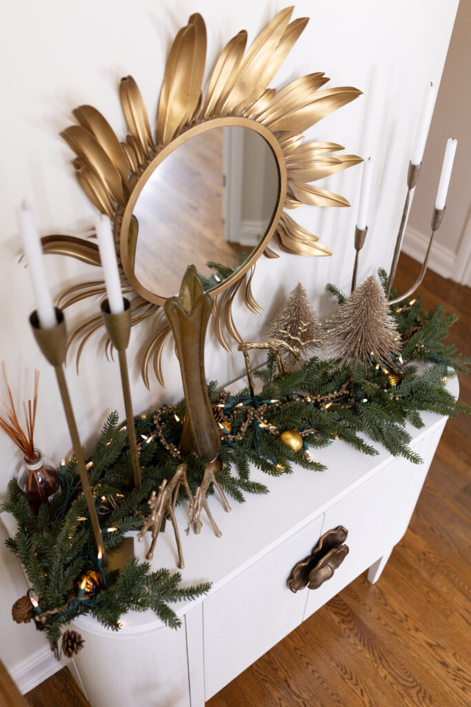 Our front entrance sets the tone, offering a first impression that feels welcoming. The console is dressed with a softly lit garland featuring eucalyptus, pine, and warm brass metallic accents.