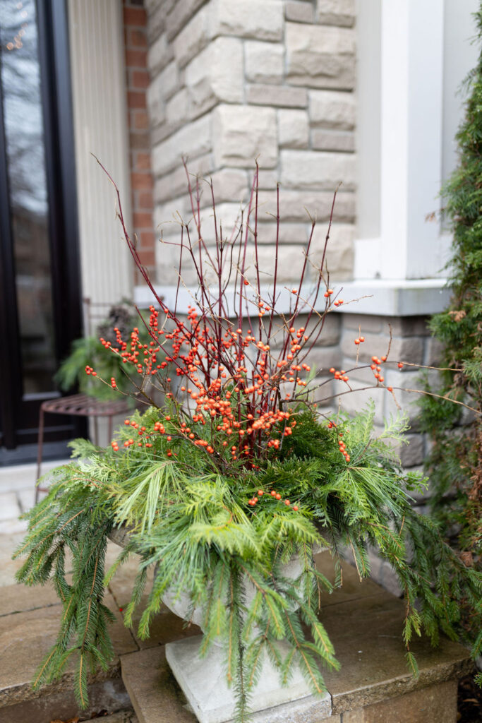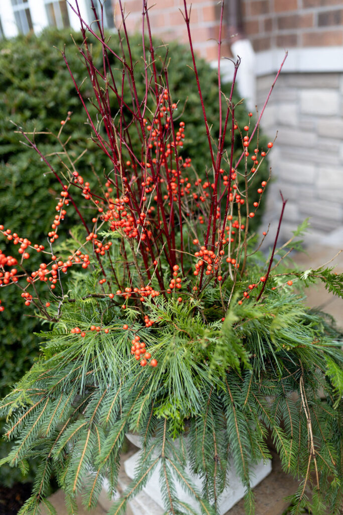 Family & guests are welcomed by an arrangement of winter greenery; spruce, pine, and cedar, balanced with subtle red elements and complemented with a stone planter.