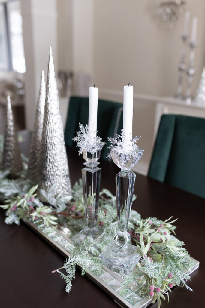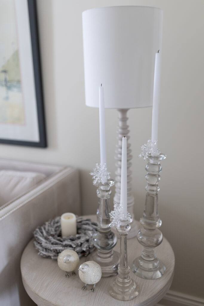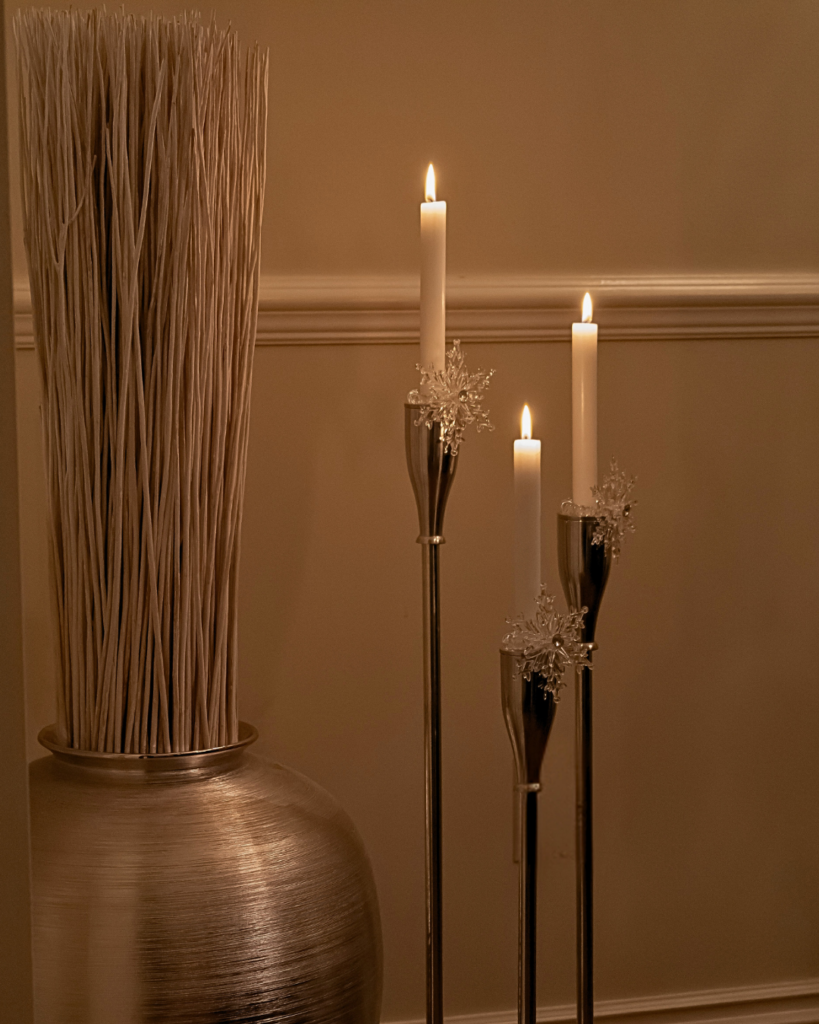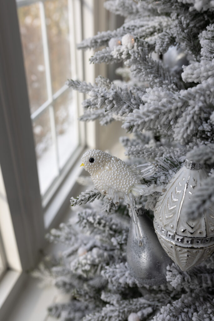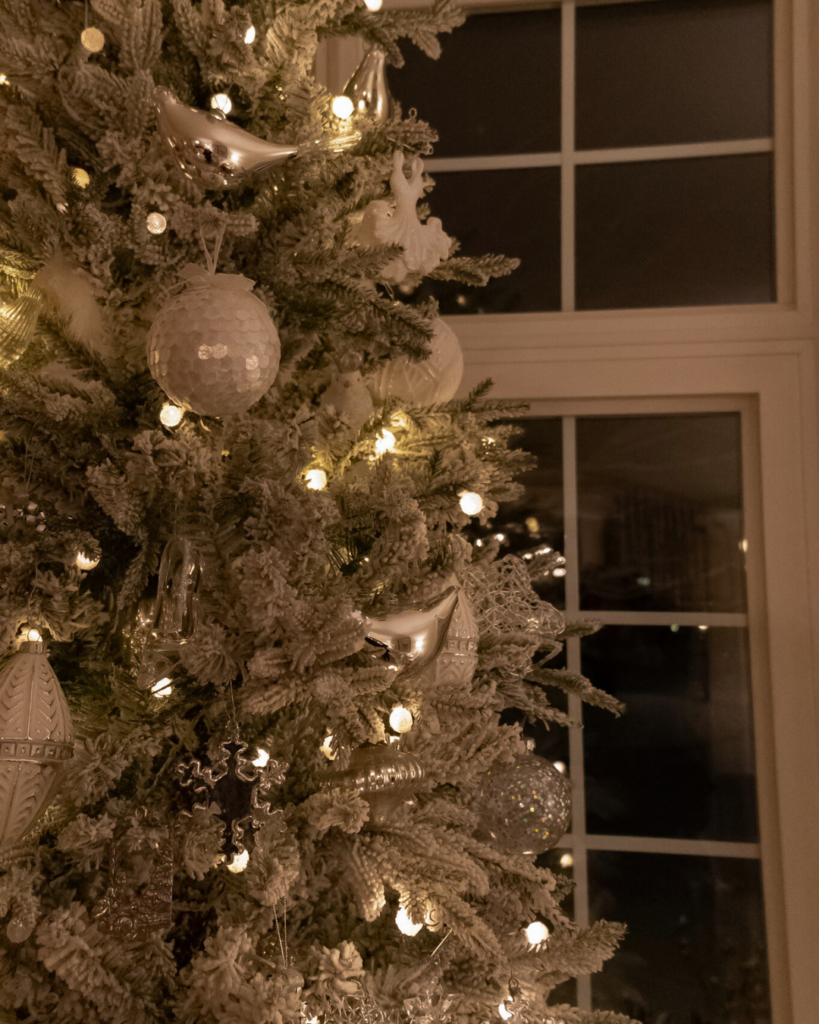 Glass ornaments, warm candlelight, and soft tones subtly catch the light, while our textured flocked Christmas tree adds depth and enhances the formal living room.