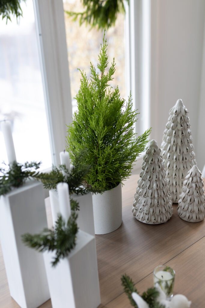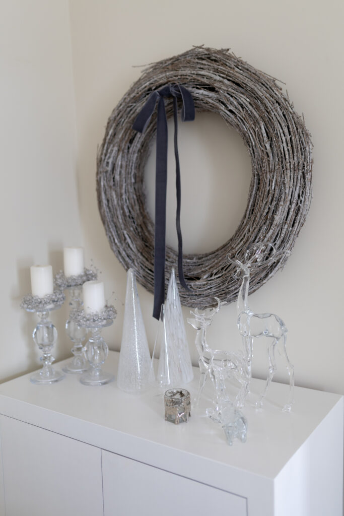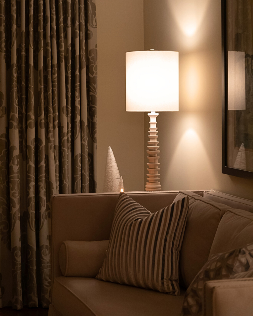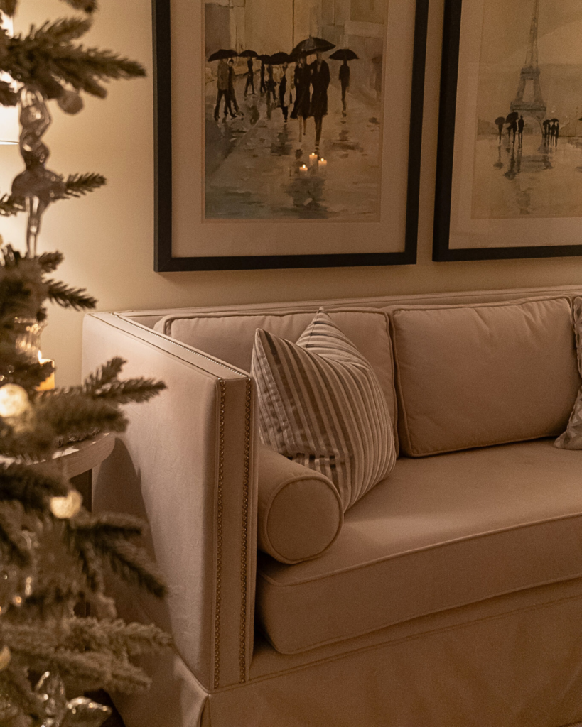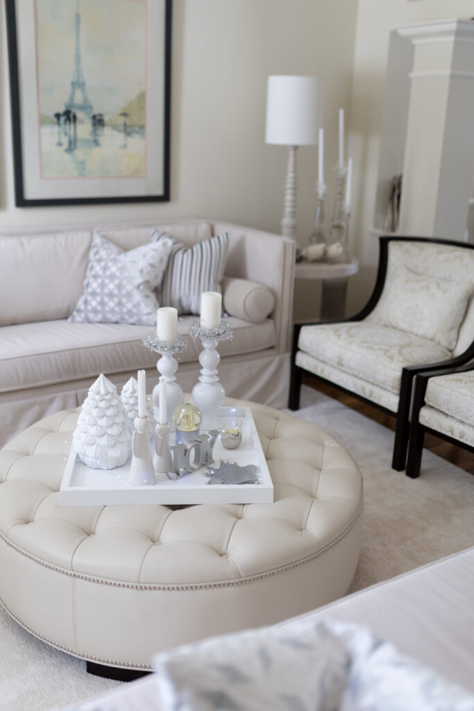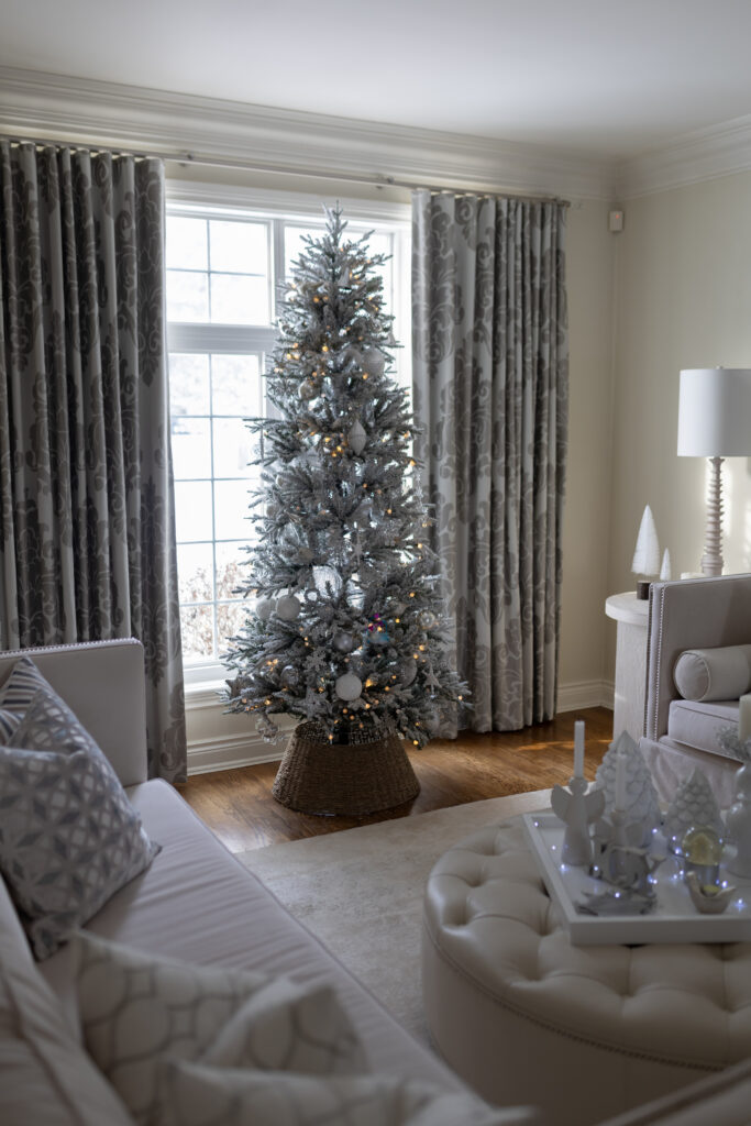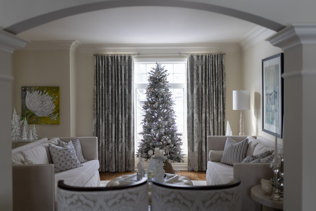 The living room is designed to feel calm and comforting. An elegant holiday space of soft whites and layered textiles creating a polished backdrop for the season.