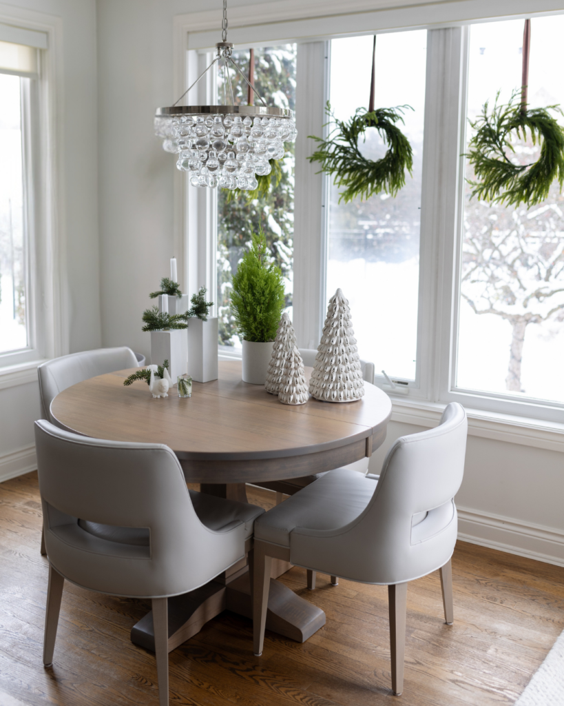 At the heart of holiday gatherings, the dining room is styled with our solid wood Canadian Made furniture complemented with classic Christmas decor.
