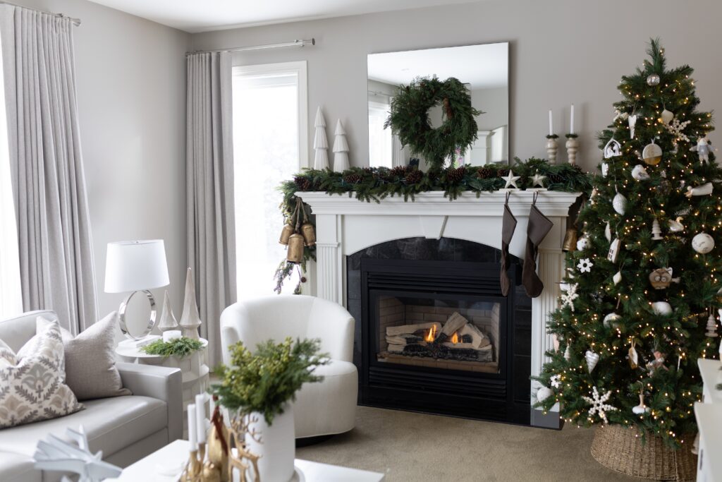 The Christmas tree becomes the focal point, settled next to the fireplace, dressed in warm lights and sentimental ornaments.